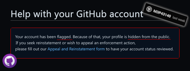 My GitHub account got flagged for no reason, it happened when I'm failed to login GitHub Desktop multiple times (due to an unknown bug that changes login URL, i had to dig up the log to get actual URL, shame that no one had any solutions at all), couple months later i migrated to ProtonMail, couple weeks later i commited some changes just like usual But GitHub desktop complaining that it cant push the commit, i tried login again, but it said that my account was not exist, thinking that i probably get hacked, i check my email and i got an email from GitHub to force-reset my password, i did that and make sure no devices are hacked (which in this case there wasn't any devices hacked) One week later i tried commiting again on GitHub Desktop for my BaDomain project, but i realized that i cant access my repos, i tried logging in, everything looks okay as usual, until i realized that GitHub now flagged my account I dont know what caused this to happen, i did nothing wrong, I tried finding solutions, including contacting GitHub support for account reinstatement request, To this day (7 days since the reinstatement request was made), GitHub staff is still not responding to my request.