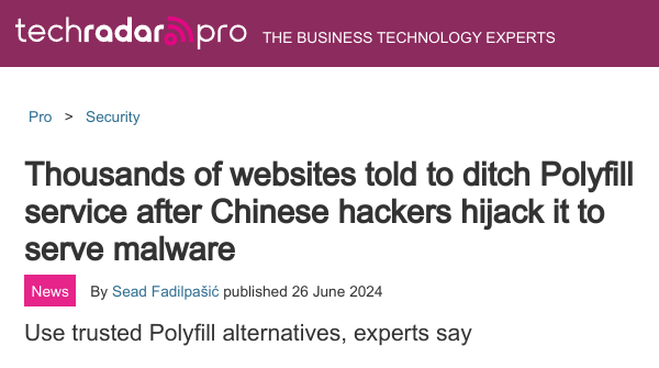 Polyfill[.]io is a free service that provides code that adds missing functions to older browsers, but out of nowhere it was suddenly bought by a Chinese company without any notification to developers that were using it, and now its literally malware that at specific time and browser will redirect to gambling sites. don't worry, its now removed from this site, plus i blocked it in BaDomain NoMalware blocklist. Read this article from TechRadar for more details